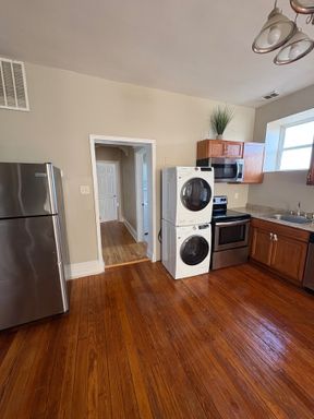 Beautiful all-electric second-floor apartment with stackable washer and dryer in the unit! The apartment is nice and updated with stainless steel appliances including a dishwasher and microwave. Central heating and cooling. Balcony off of the back bedroom. Fenced-in backed yard.